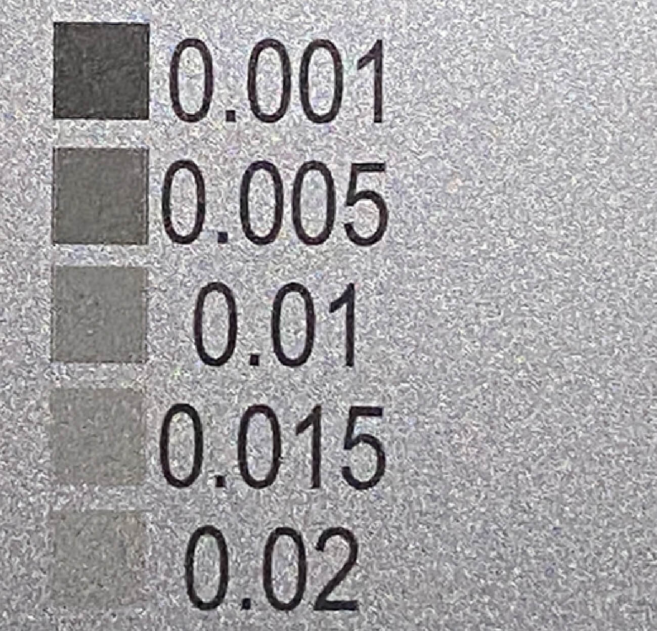 Based on experimental observations, the following parameters are recommended for laser marking anodized aluminum to achieve optimal black marks: