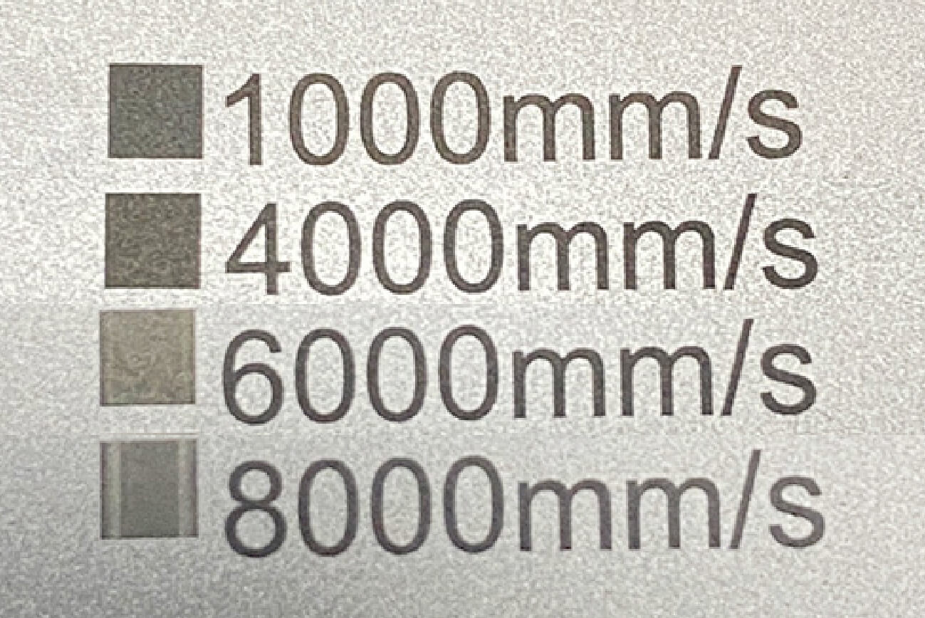 Marking speed affects how much energy the laser deposits per unit area. Slower speeds (1000–3000 mm/s) allow more dwell time, resulting in dense, deep, and uniform black marks. Medium speeds (4000–5000 mm/s) still yield dark marks with slightly reduced depth. High speeds (6000–8000 mm/s) produce grayish, uneven markings due to insufficient energy per spot.